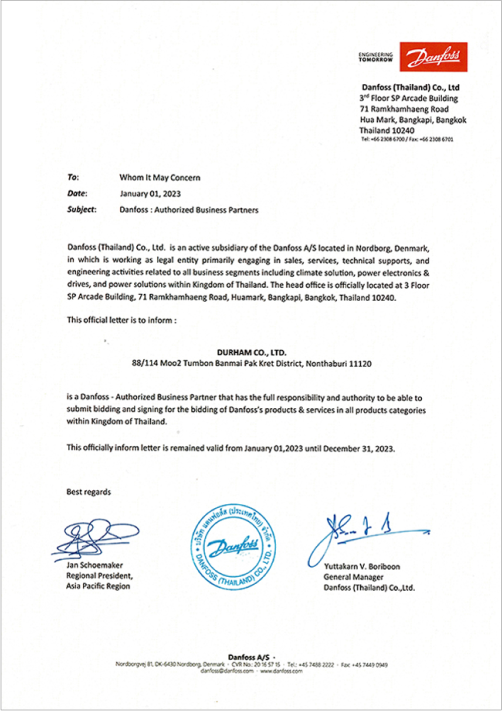 บริษัท ดูรัม จำกัด ได้รับการแต่งตั้งเป็นตัวแทนจำหน่ายสินค้าและอุปกรณ์ บริษัท แดนฟอส์ส อย่างเป็นทางการ เรียนรู้เพิ่มเติม Product VLT® Soft Starter MCD 600 อ่านเพิ่มเติม VLT® Midi Drive FC 280 อ่านเพิ่มเติม VLT® Micro Drive FC 51 อ่านเพิ่มเติม ดูทั้งหมด ติดต่อ 02-961-6424094-435-8542 our social media Youtube ที่อยู่บริษัท 88/114 หมู่ 2 ตำบลบ้านใหม่ อำเภอปากเกร็ด จังหวัดนนทบุรี 11120